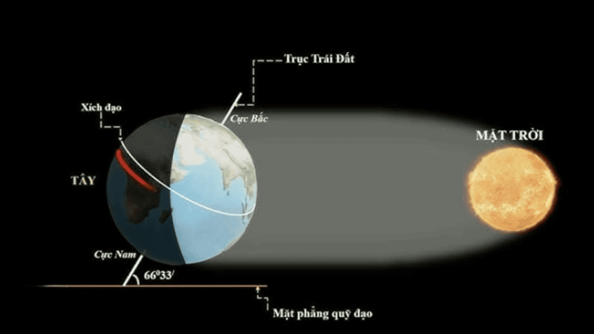 Sự thật là Trái Đất không đứng thẳng mà nghiêng 23,5° so với quỹ đạo của mình. Vì trục nghiêng này, có thời điểm một bán cầu sẽ nghiêng về phía Mặt Trời và nhận nhiều ánh sáng hơn. Khi bán cầu Bắc nghiêng lại gần Mặt Trời, ánh nắng chiếu lâu hơn, Mặt Trời mọc sớm và lặn muộn, tạo ra hiện tượng ngày dài đêm ngắn mà Bé thường thấy vào mùa hè.