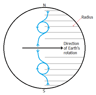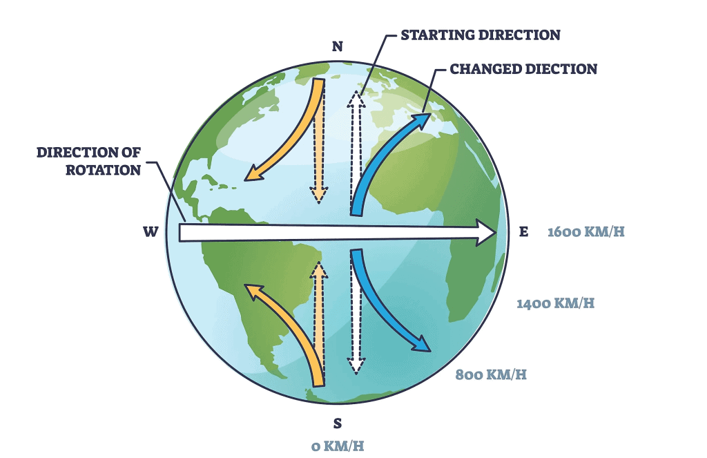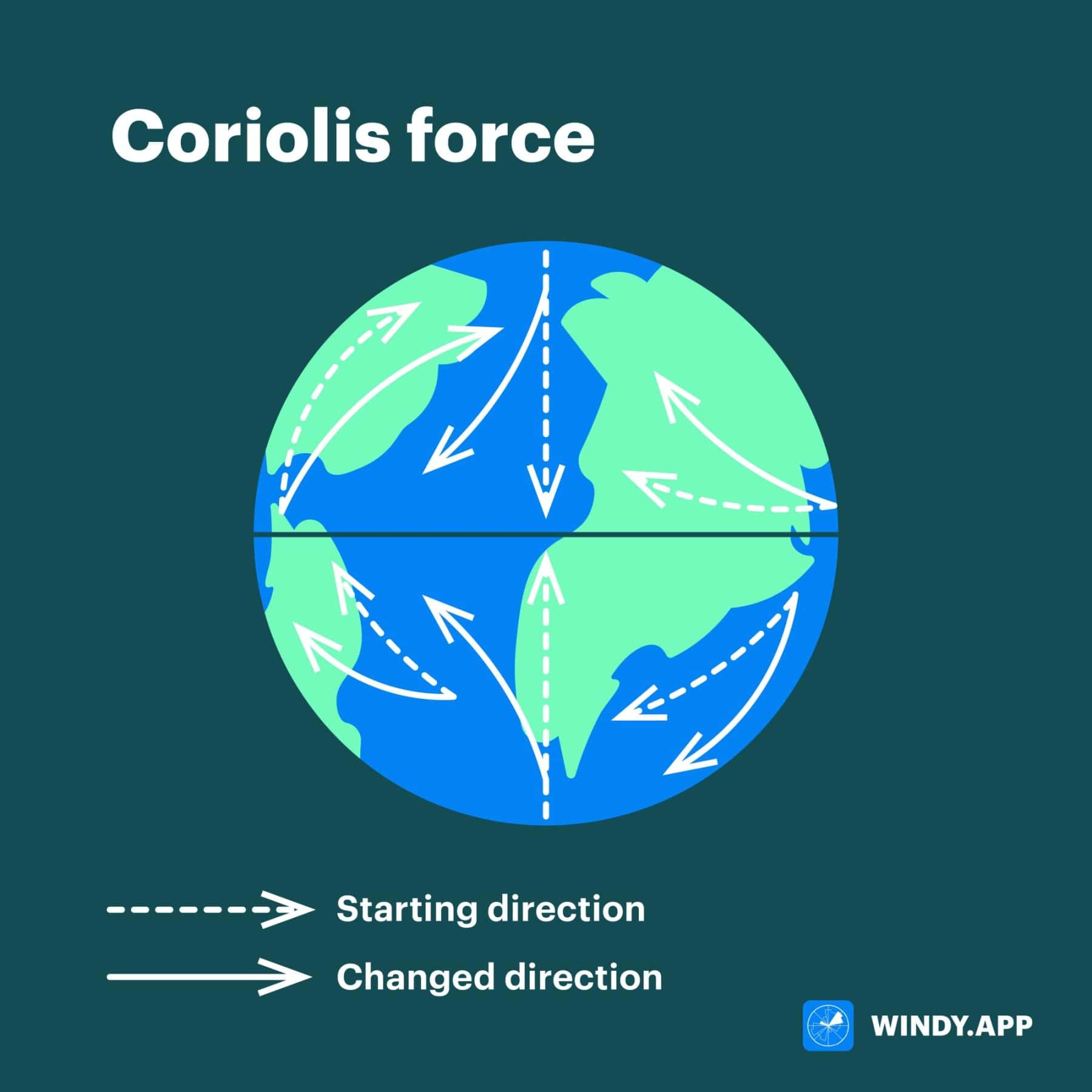 Khi không khí di chuyển: Ở bán cầu Bắc, gió bị lệch sang bên phải hướng đi và ở bán cầu Nam, gió bị lệch sang bên trái.