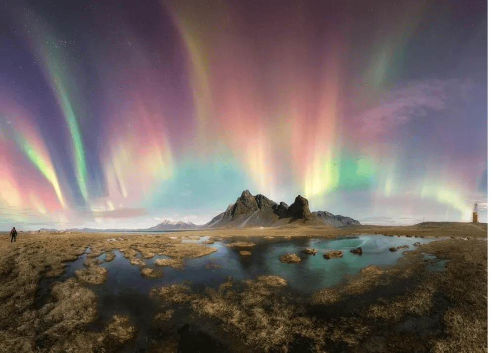 The colors of the aurora depend on the type of gas in the atmosphere and the altitude where the energetic particles collide. When interacting with oxygen, the aurora often appears green or red, while collisions with nitrogen create purple, pink, or blue light. This combination makes the night sky become mystical and radiant, like a painting created by nature itself.