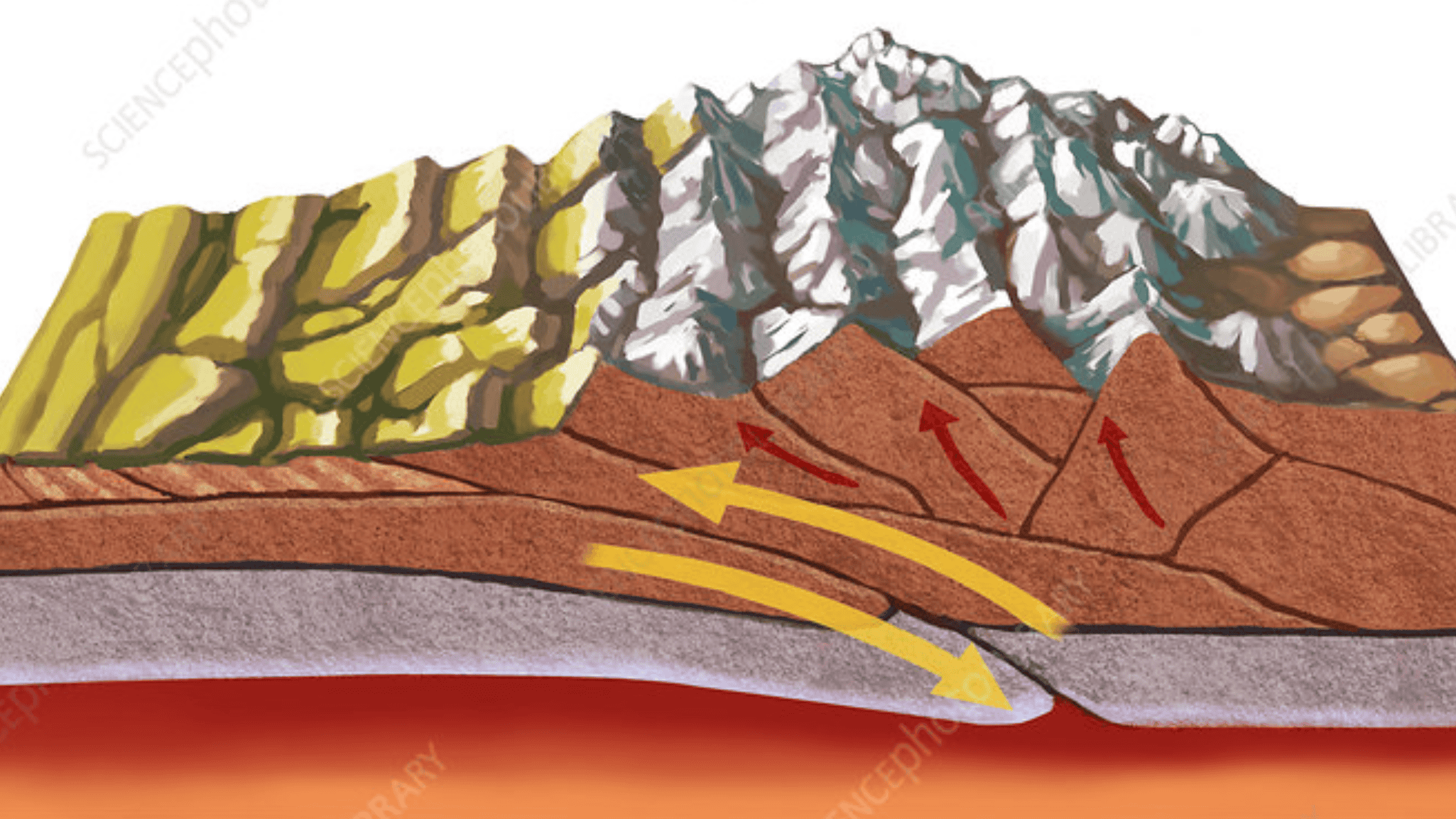 Thực ra, bề mặt Trái Đất được chia thành nhiều mảng lớn gọi là mảng kiến tạo. Những mảng này luôn âm thầm chuyển động rất chậm. Khi hai mảng va chạm vào nhau, lớp đá bị ép lại, nhô lên cao và dần dần hình thành núi.In fact, the Earth’s surface is divided into large sections called tectonic plates. These plates move very slowly. When two plates collide, the rocks are pushed upward and gradually form mountains.