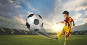 A stronger kick makes the ball accelerate faster (Second Law). When running or jumping, athletes use the reaction force from the ground (Third Law). Many sports apply these laws.
